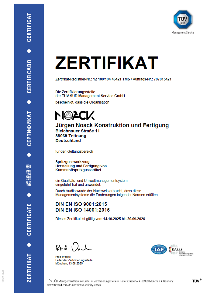 Mit über zwei Jahrzehnten Erfahrung in diesen Bereichen können wir auf eine beeindruckende Geschichte zurückblicken. Seit 2020 sind wir stolz darauf, im Bereich Spritzgusswerkzeugherstellung und Fertigung von Kunststoffspritzgussartikeln nach den Standards der DIN EN ISO 9001:2015 sowie DIN EN ISO 14001:2015 zertifiziert zu sein.